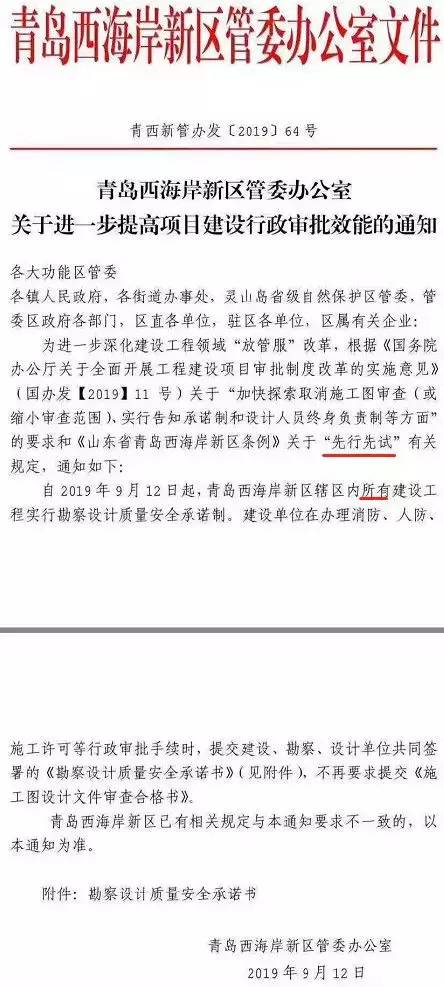 近日青岛西海岸新区管委办公室发布《关于进一步提高项目建设行政审批效能的通知》,明确提出:自2019年9月12日起,青岛西海岸新区辖区内所有建设工程实行勘察设计质量安全承诺制。建设单位在办理消防、人防、施工许可等行政审批手续时,提交建设、勘察、设计单位共同签署的《勘察设计质量安全承诺书》,不再要求提交《施工图设计文件审查合格书》。