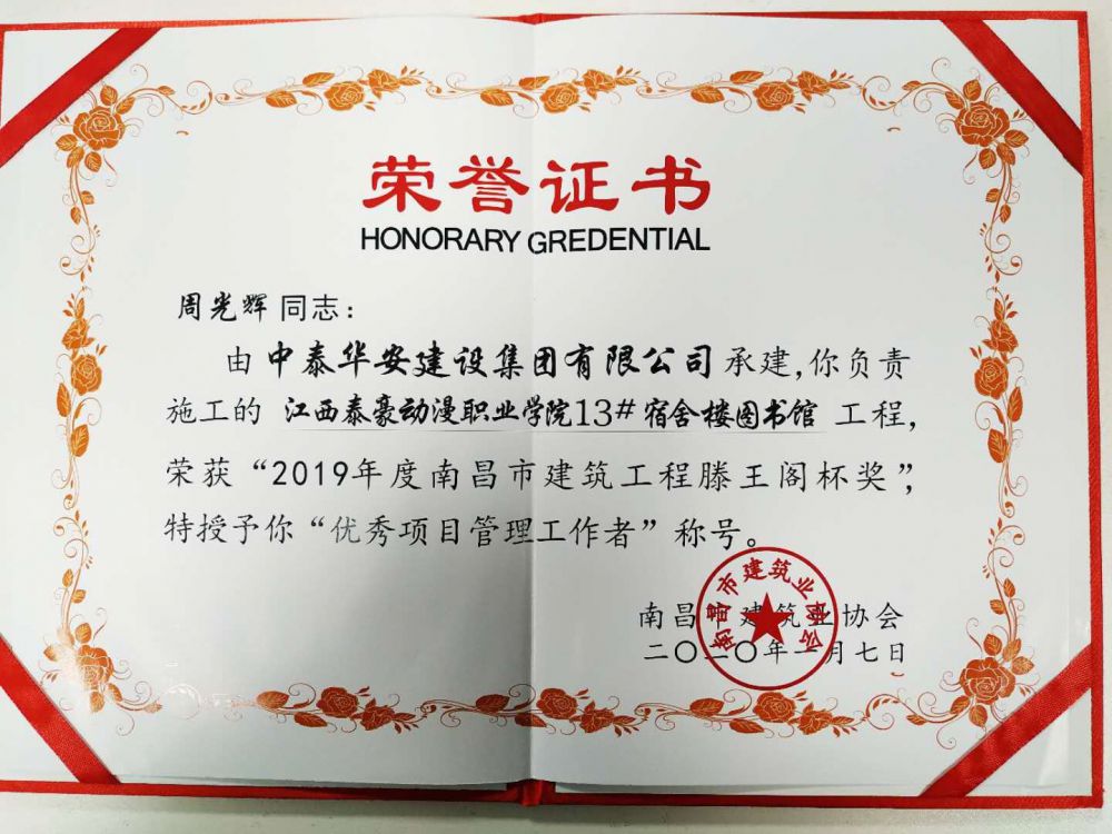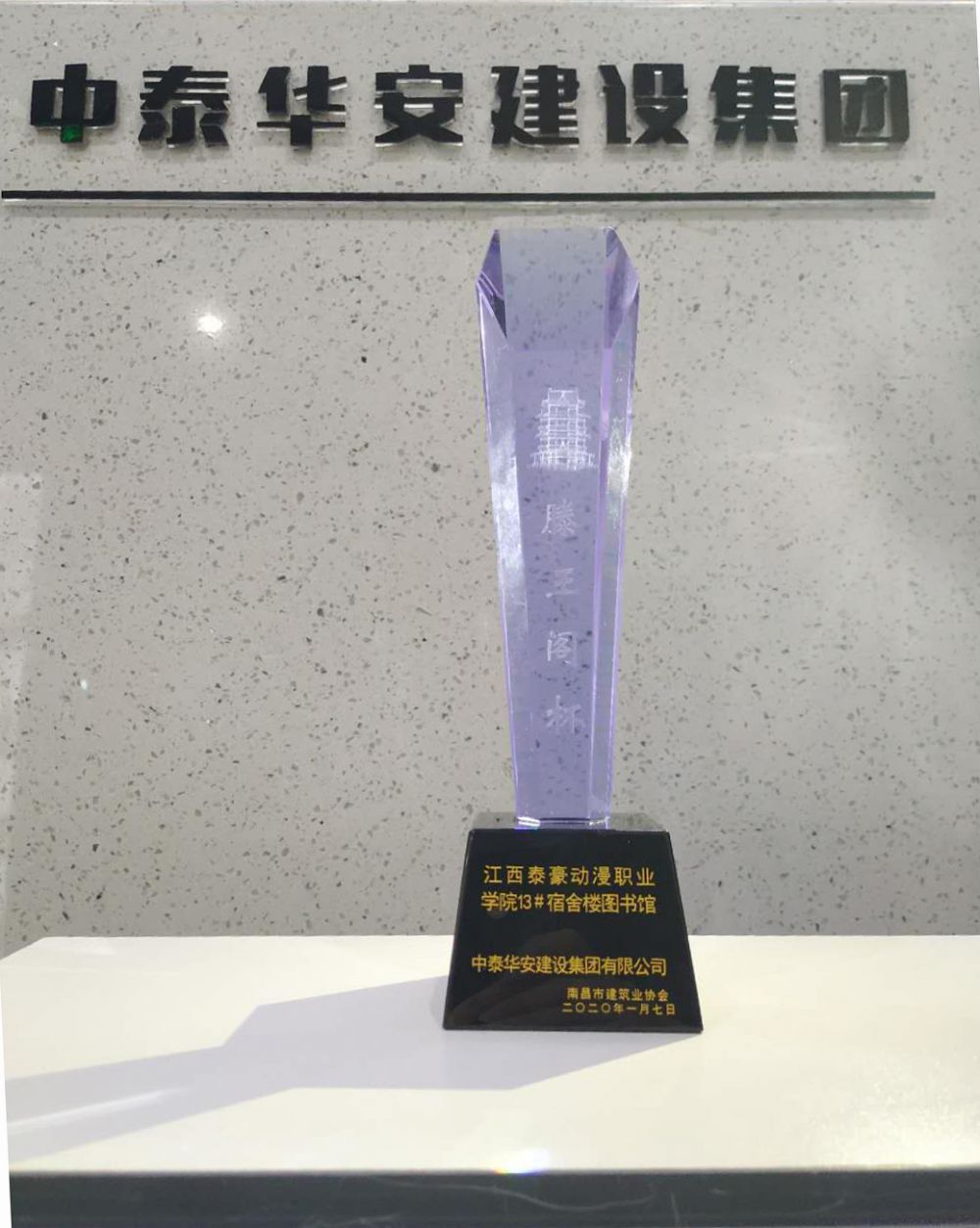 “滕王阁杯奖”是南昌市建筑工程质量最高奖项,由南昌市建筑业协会进行评定,主挑选出质量高、代表性强、影响力广的行业质量标杆工程进行表彰。此次我公司承建的江西泰豪动漫职业学院13#宿舍楼图书馆工程能获此殊荣,充分展示了中泰华安建设集团先进的质量管理水平。我司将继续秉承以人为本,厚德载物,高效优质,重誉守信的企业精神,以不断提升建筑品质和居住环境为目标,最终使得中泰华安建设集团成为业内的工程质量标杆和中国知名的创新型品牌企业。