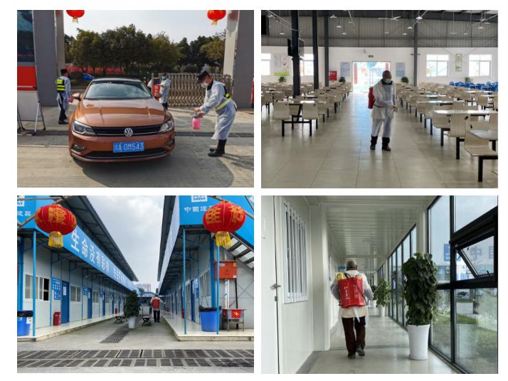 ▲进场车辆消毒、生活区、食堂、工作区域定时消毒