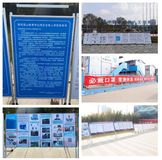 在办公区、生活区等人员出入口醒目位置张贴《致成都凤凰山体育公园项目全体人员告知书》、疫情防控“小常识”、疫情防控“三字经”、个人防护54字守则、保洁消杀制度等防疫标识,加强疫情防控引导与教育。