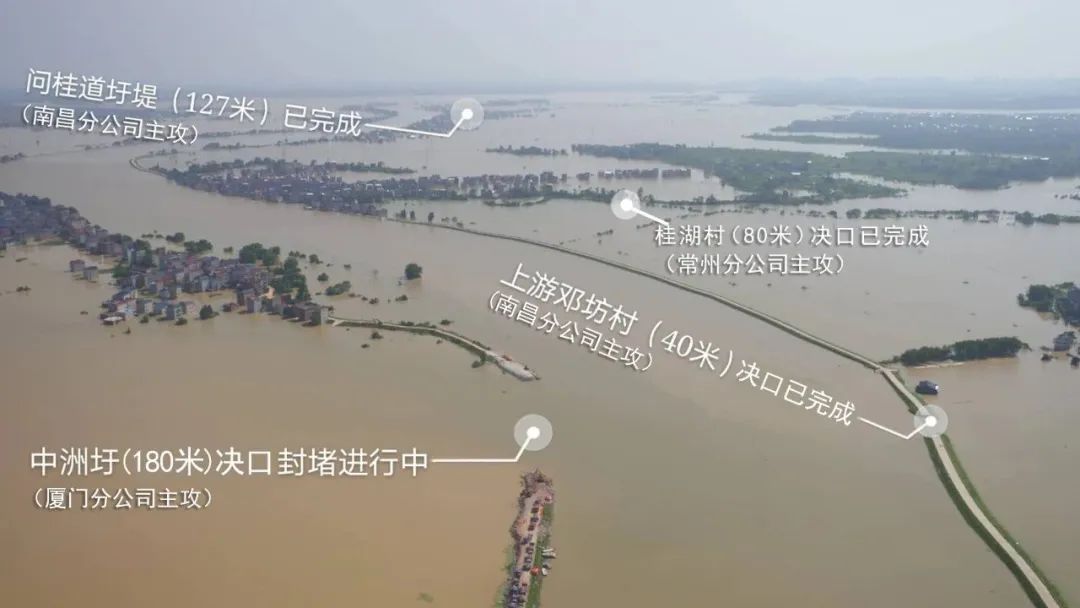 中国安能集团第二工程局临危受命,全力攻坚,组织400余人对鄱阳湖周边冲毁圩堤决口进行封堵;在高温酷暑、蚊叮虫咬等恶劣环境下,他们充分发挥水电铁军“攻坚克难、敢打必胜”的精神,日夜奋战在抗洪抢险第一线。