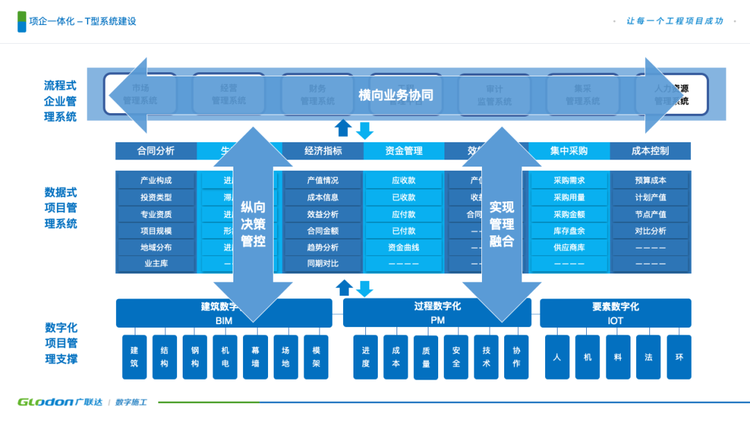 当下阶段,我们面临的挑战就是这样的两个系统能不能融合一体形成一个T型系统的问题。当企业在做流程管理的过程中,当我们审批分包单的时候,我们可以查看到项目上干了多少工程量,是否有质量安全问题,进度有没有被拖延等等。这样就可以为企业带来直接效益,也就是我们认为T型系统建设的重要性。