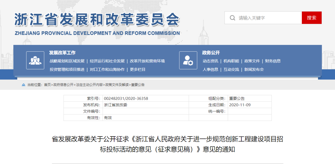 为建设全省统一开放的工程建设项目招标投标大市场,加快打造“整体智治”的招标投标监管体系,巩固和深化“放管服”和“最多跑一次”改革成果,深入推进招标投标体制机制创新,强化招标人主体责任,提高招标投标效率,保障招标投标活动公开、公平、公正,优化招标投标领域营商环境。省发展改革委牵头开展了《浙江省人民政府关于进一步严格规范工程建设项目招标投标活动的意见》(浙政发〔2014〕39号)修订工作。现向社会公开征求意见,有关单位和社会公众可登陆浙江省发展和改革委员会门户网站(http://fggw.zj.gov.cn)查阅公开征求意见稿,有关意见建议可在2020年11月18日前反馈至省发展改革委公管处。为方便联系,反馈意见时敬请预留联系方式。