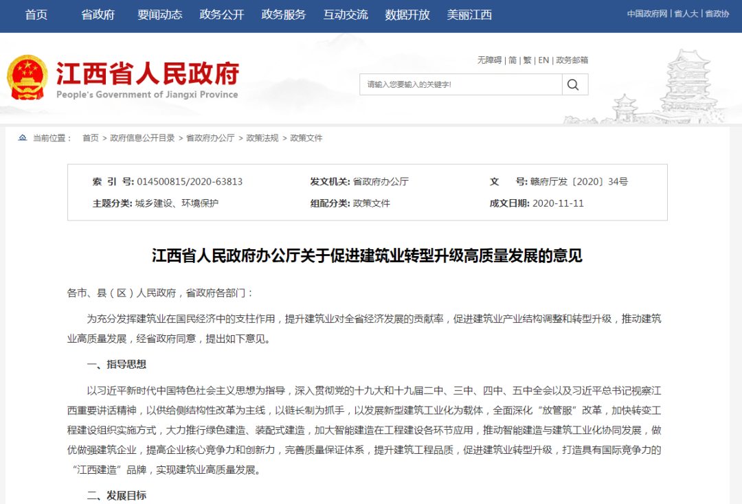 江西省人民政府办公厅关于促进建筑业转型升级高质量发展的意见