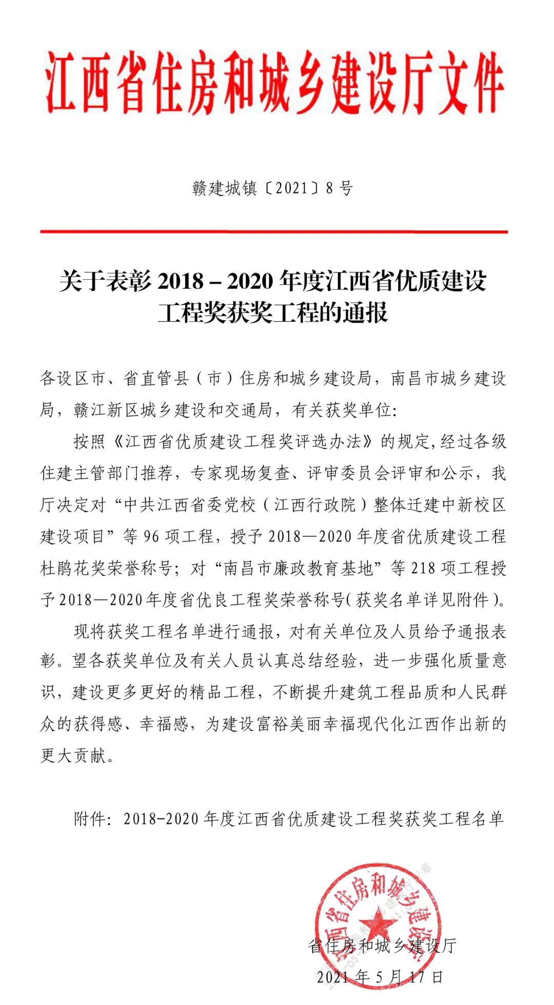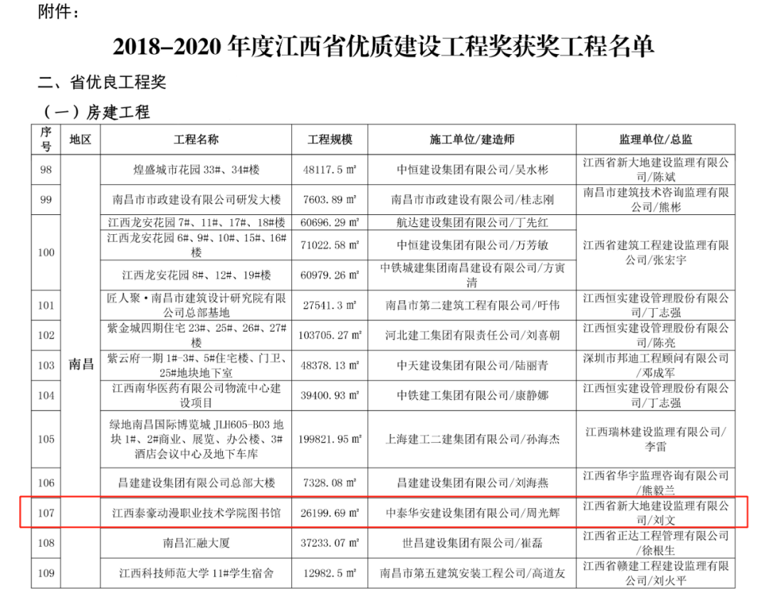 年度江西省优质建设工程奖获奖工程的通报》对