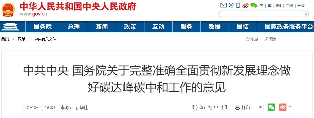 中共中央 国务院关于完整准确全面贯彻新发展理念做好碳达峰碳中和工作的意见