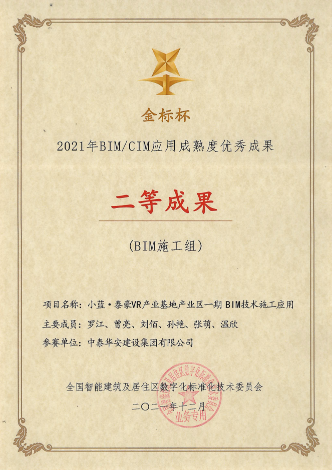 “金标杯”BIM/CIM应用成熟度创新大赛作为建筑领域知名度较高的全国性BIM赛事,由全国智标委主办,中国建筑节能协会智慧建筑专委会等单位协办,共有760家单位、1155项作品参赛。经过线上投票、专家评审和公示等评选环节,我司参赛的《小蓝·泰豪VR产业基地产业区一期BIM技术施工应用》作品荣获BIM施工组二等奖。《江西东方雨虹建筑材料有限公司生产基地BIM技术应用》作品荣获BIM施工组三等奖。