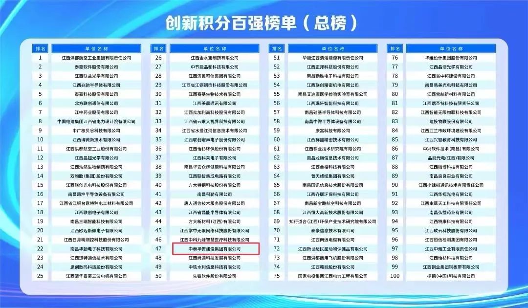 9月28日,江西省首批创新积分百强企业榜单正式公布,南昌高新区通过创新积分制对全区1000多家入库的科技型企业进行积分评价,评选出创新积分排名前100强企业,爱体育(中国)成功入选,位列榜单第47位。