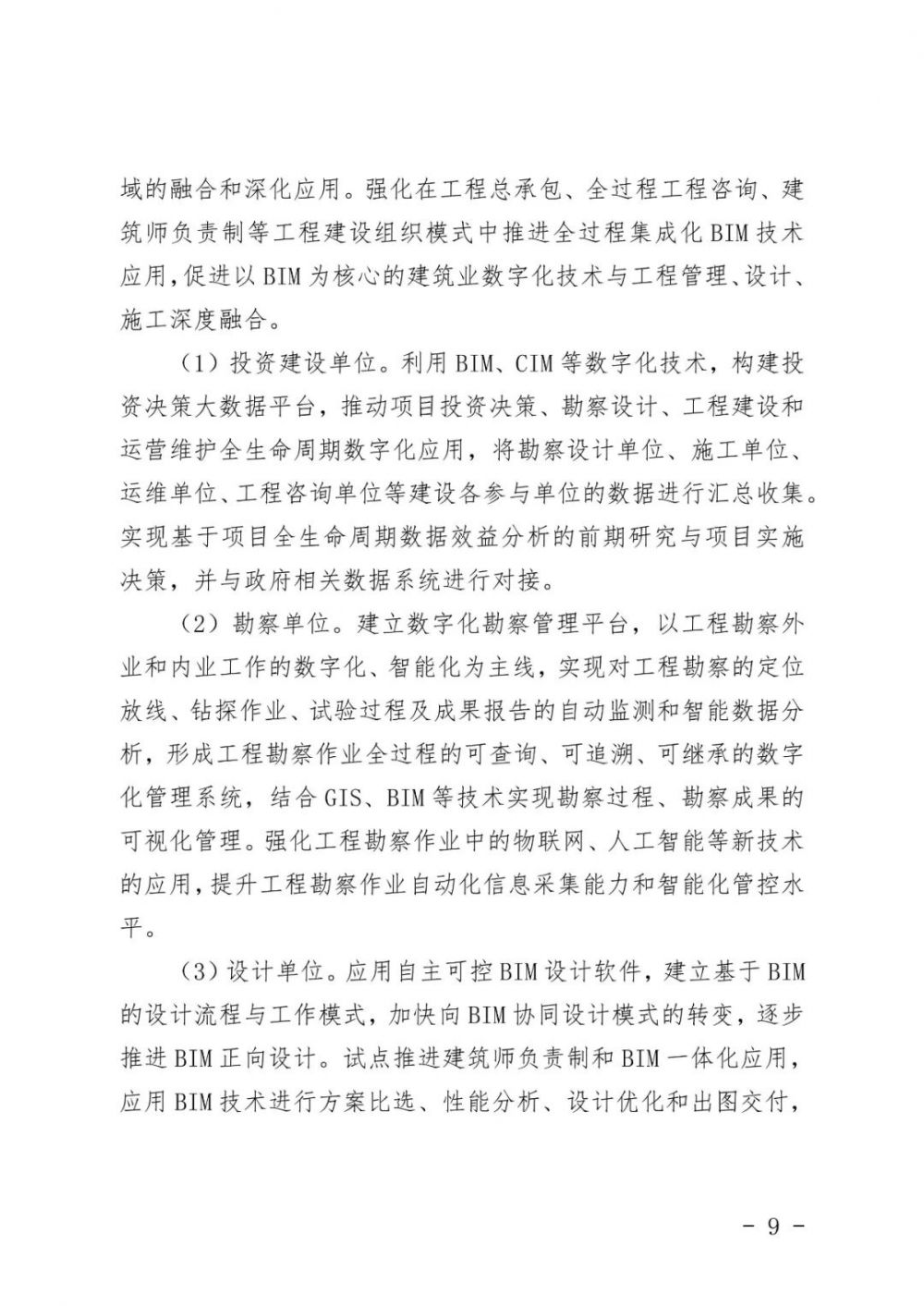 其中,在加强数字项目建设中,对投资建设单位、勘察单位、设计单位、施工单位、运维单位和全过程工程咨询单位加快推进建筑信息模型(BIM)技术在工程全生命期的集成应用提出了明确要求。