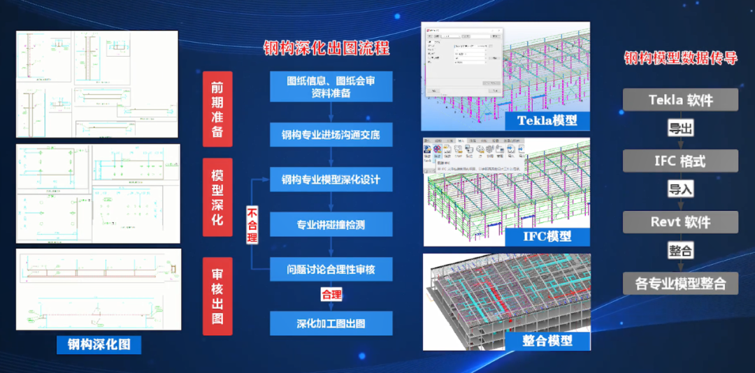 根据制定的BIM建模标准,创建建筑、钢结构、机电各专业模型;通过专业间碰撞检查、专项问题审查,两个主要方式进行BIM图审,形成图审报告7份,共查找有效图纸问题188条。通过与设计持续沟通,跟踪解决问题,从而避免因图纸问题导致工期影响。